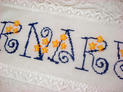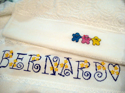incrustadas em cada letra, quase como pequenas pérolas. Na toalha de rosto,